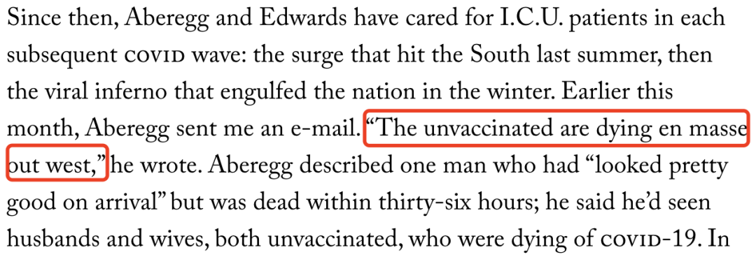 根据《纽约客》报道,有美国ICU医生表示:“西部未接种疫苗的人,正在大量死亡。”