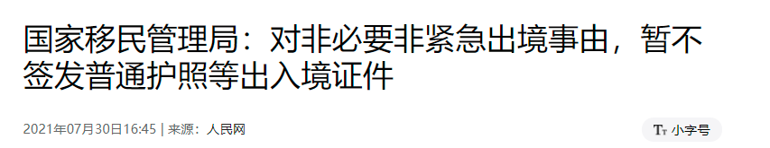 上周五(7月30日),中国移民管理局新闻发言人在记者会上表示,因防疫需要,暂停办理非紧急的出境签证安排,并强调“坚持非紧急、非必要不出境,严格审批签发内地(中国)居民出入境证件,确保防疫安全。”