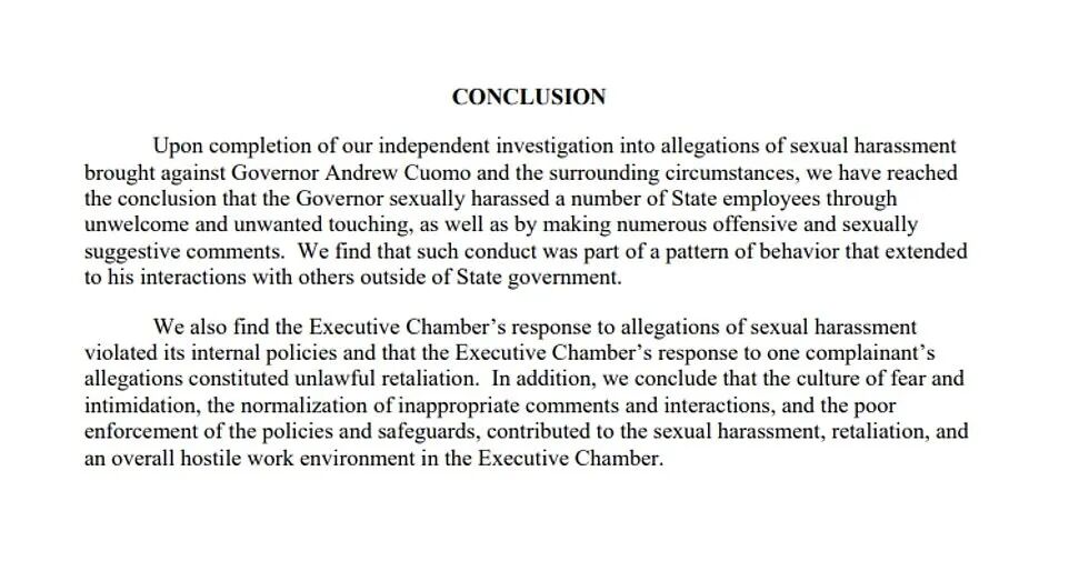 这份长达165页的报告,其中详述了对179名证人的采访,以及对数万份文件审查的结果坐实:库莫至少对11名女性进行了性骚扰,其中许多是年轻女性。