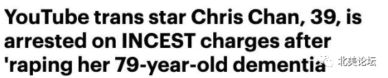 太变态了!变性网红长期侵犯患有痴呆母亲,网友:真恶心... 39岁的变性网红Chris Chan,由于性侵其79岁患有痴呆症的妈妈被指控乱伦,遭到抓捕。”