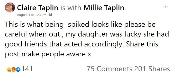 但在喝了几口后,Millie感到非常恶心。她说:“我喝了几口酒,然后去了吸烟区。当我回来时,我觉得自己喝得太多了,然后我就开始整个人都不好了”。