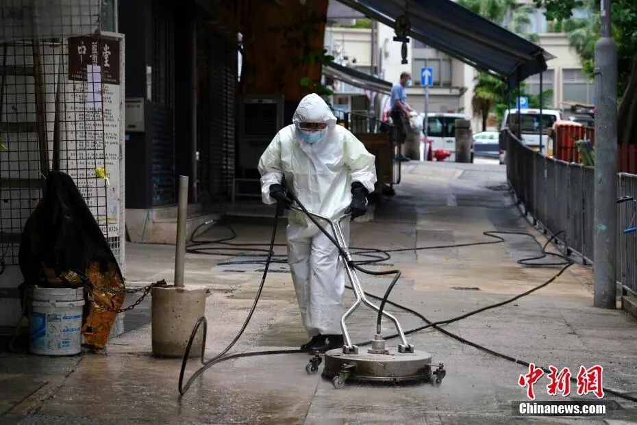 资料图:身穿防护服的清洁工清洗路面。中新社记者 张炜 摄