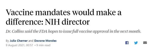 ABC9日报道,美国国家卫生研究院(NIH)院长弗朗西斯·柯林斯于8日作客该媒体“本周”栏目中表示,美国在控制德尔塔变异毒株激增这件事上“失败了”。