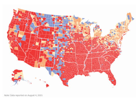 在美国,不同地区病毒的分布水平各不相同。CDC根据每个县过去7天每10万人新增病例数和检测阳性率做出了分类。