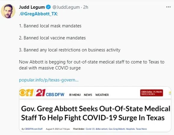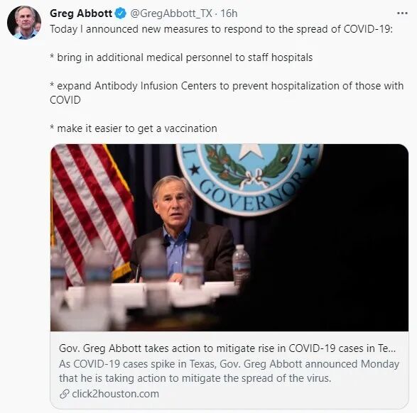 当时,面对来势汹汹的Delta变种,美国总统拜登前脚刚对联邦雇员发出强制疫苗令,后脚德州州长Greg Abbott站出来表态:戴口罩或者打疫苗,靠个人自觉,不应该由政府强制执行。