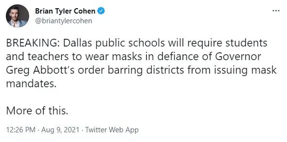 但是,德州其他人坐不住了!当地学区的负责人正在自行解决问题,并无视州长对戴口罩的禁令。