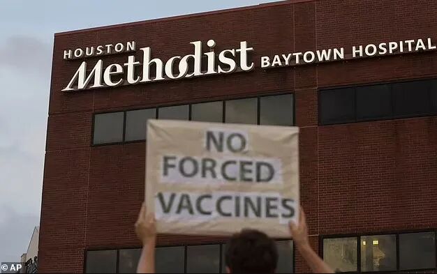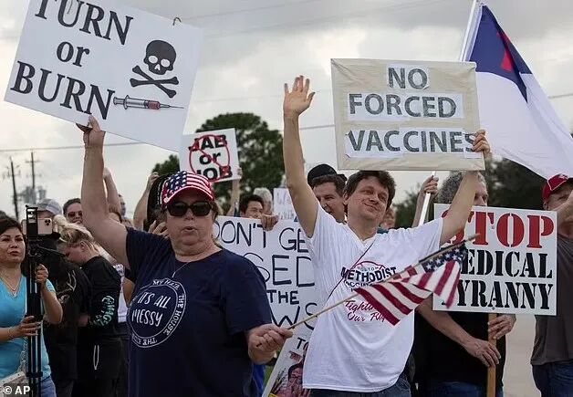 6月7日时,休斯顿一家医院门口还聚集了一批反疫苗人士: