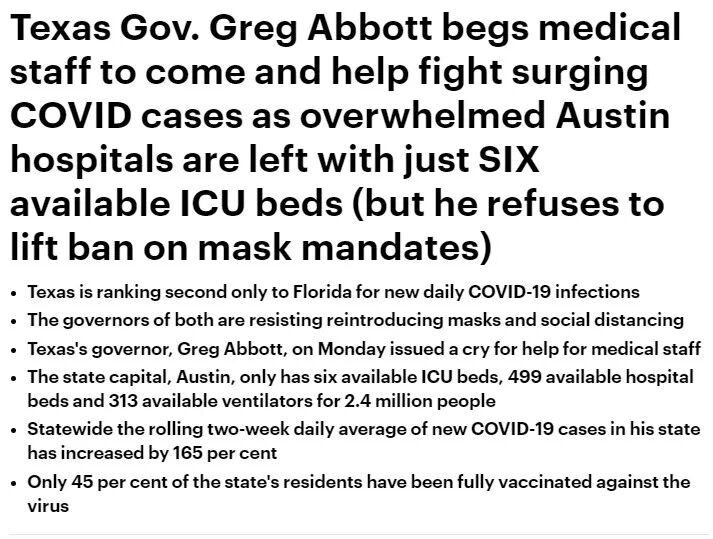 德克萨斯州州长Greg Abbott 周一发表讲话,恳求医务人员前来帮助抗击激增的新冠病例,因为在拥有240万人口的德州首府奥斯汀,眼下只剩下 6 张可用的 ICU 病床、499 张可用的病床和 313 台可用的呼吸机。