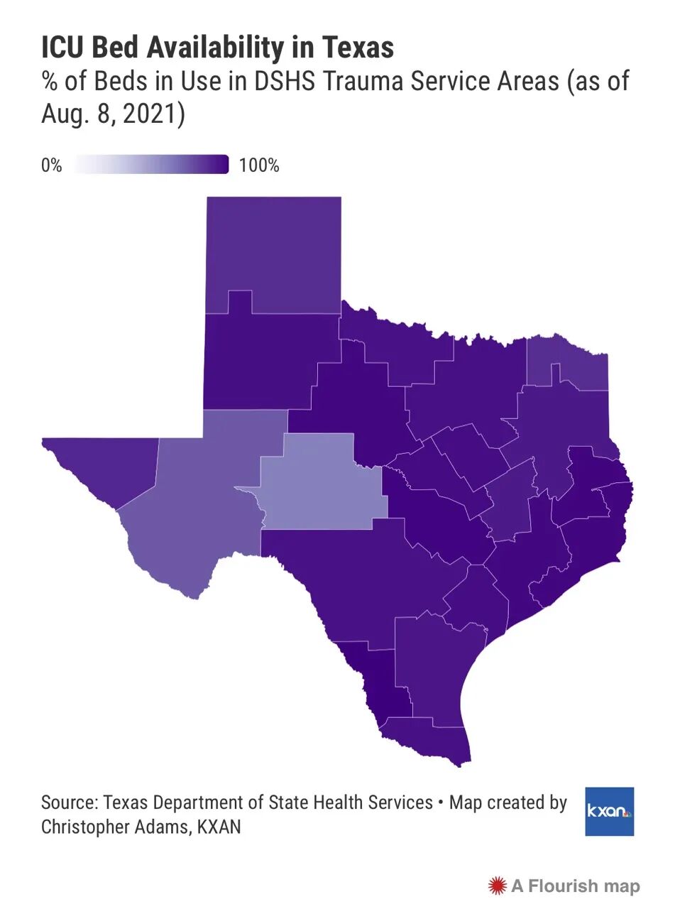 德州卫生与公共服务部的数据显示,一个月前全州有 800 多张 ICU 病床可用。截至最新更新,现在有仅有394。而德州的人口接近 2900 万。