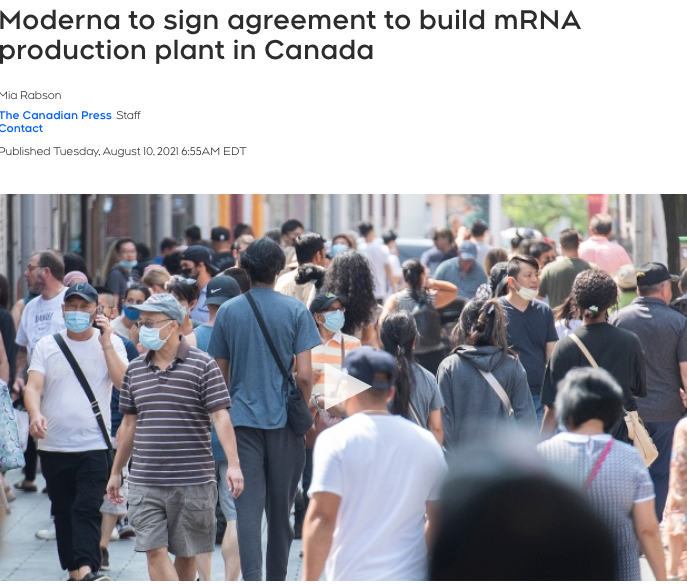 美国制药商Moderna 8月10日将与加拿大政府签署协议,承诺在加拿大建立一个药厂生产mRNA疫苗。
