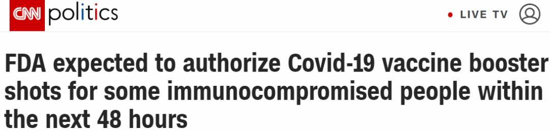 CNN称,FDA将授权为一些免疫功能较差的国民,接种第三针辉瑞或Moderna疫苗。消息人士指,FDA预计将在48小时内宣布该决定。