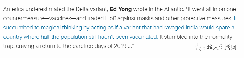 在针对开学问题上,Ed Yong在《大西洋》杂志上写道:"美国低估了delta的变体,一个人口接种率只有一半的国家,它跌入delta的陷阱非常正常,虽然美国人渴望回到2019年的无忧无虑的日子,并将2021年的开学季作为全新希望的开始,但是人们必须意识到,我们永远无法实现 "完全消灭病毒的'零COVID'梦想",大流行病的结束是在 "几乎所有人都有免疫力的时候,最好是因为他们接种了疫苗,或者是因为他们被感染并存活下来。"