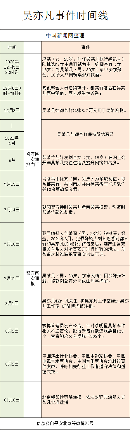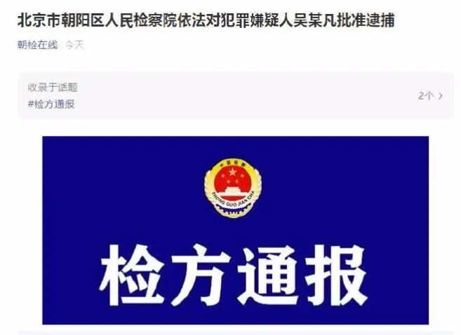据“朝阳检察”官方微博消息,2021年8月16日,北京市朝阳区人民检察院经依法审查,对犯罪嫌疑人吴某凡以涉嫌强奸罪批准逮捕。