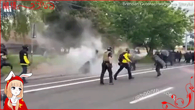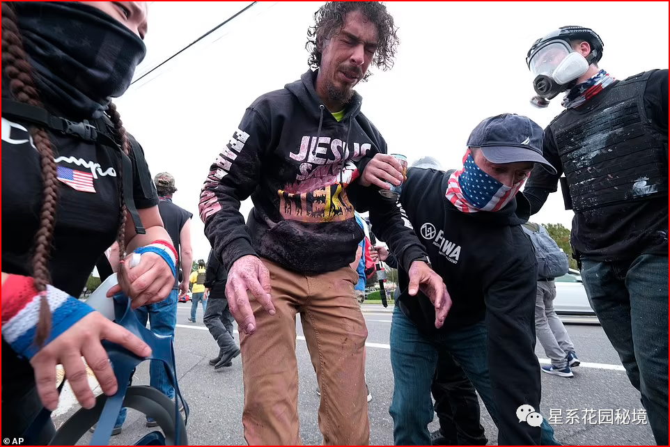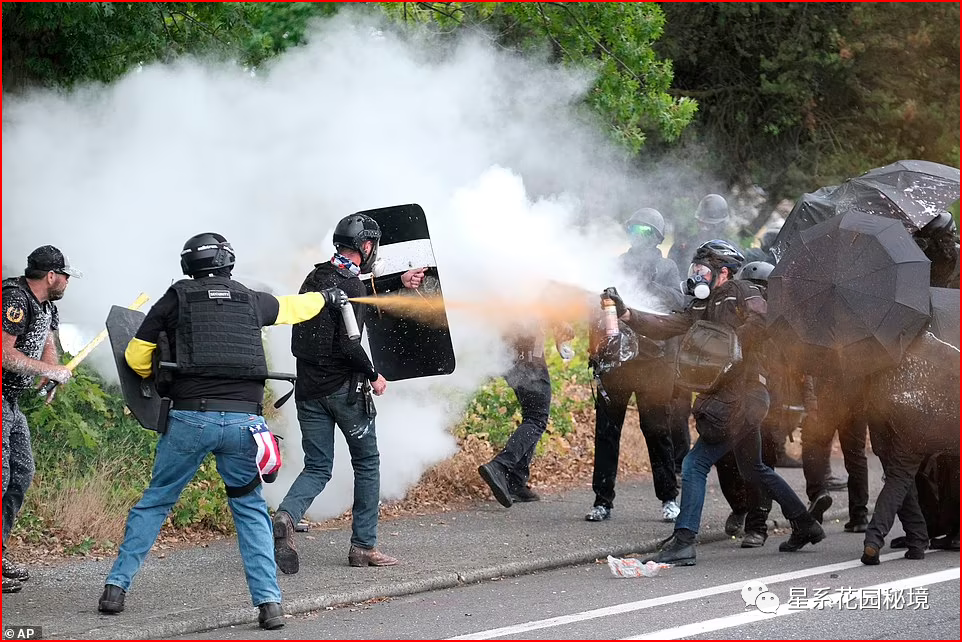 他们甚至向一些路过的驾驶员(疑似川普粉丝)喷射辣椒水… 于是,该活动立即演变为暴力事件,接到电话赶来的骄傲男孩们,对黑衣军团展开了追打。到了大街上之后,双方支持者都卷入了 由于是街头混战,附近的加油站和便利店随后遭到一系列爆炸和空气弹的袭击。 在双方的医护人员赶来治疗伤员之前,混战短暂停止了几分钟,在反法西斯抗议者撤退之前,骄傲男孩的成员高呼“这是谁的街道?是我们的街道!”
