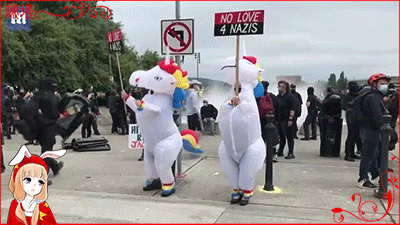 据俄勒冈州公共广播电台报道,当天的骚乱发生在川普支持者和反对他们的示威者之间,这是去年第一次大规模冲突的周年纪念日,为了纪念狠狠地揍了政敌,两边的人群都携带着头盔、球棒和枪支。 安提法此番派出了彩虹独角兽 和他们特色的战鼓大队 标语牌写着“对纳粹分子没有爱心”
