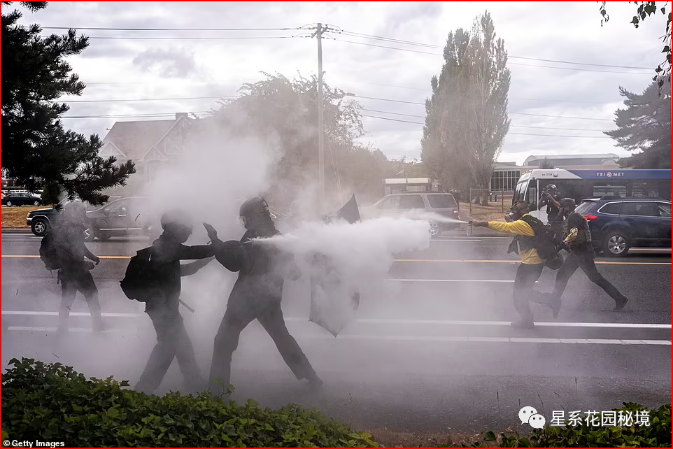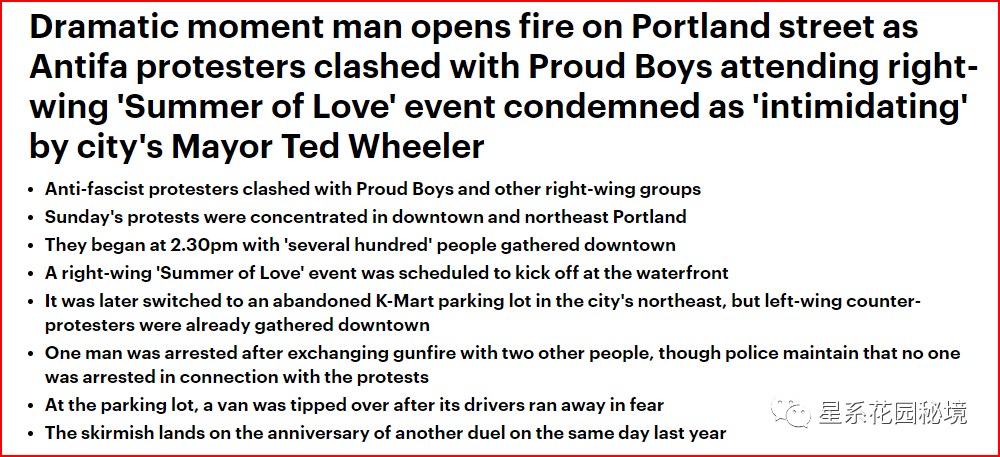 8月22日,波特兰大街上从早到晚都是安提法队伍与川普支持者的群殴。原本这也比较正常,支持和反对彻查大选作弊的人不想揍死对方才不科学。然而,原本只是持械互殴,怎么突然有人拔出了枪“砰砰砰”的声音出现在了视频中…… 反法西斯抗议者与支持川宝的骄傲男孩 以及其他右翼团体发生械斗 周日抗议活动集中在市中心和波特兰东北部 下午2:30开始数以百计的参战者聚集到市中心 一场美国右翼的“爱的夏天”活动 计划在这个城市的海滨拉开帷幕 但由于当地官府和反法西斯组织的阻挠 庆典被转移到城市东北部一个废弃的K-Mart停车场 但左翼的反示威者提前赶到这儿埋伏 一些人趁乱互相射击后被捕 但警方坚称他们都不是因示威而被捕的 1 双方支持者拔枪对射8月22日波特兰群殴的视频在网上疯传,其戏剧性的画面显示,在市中心发生枪战后,反法西斯示威者向一名支持川普的枪手射击,而该男子则用手枪向混乱的黑衣人群开枪。 周日,这名川普支持者找到了一个垃圾桶后的安全地带,拔出手枪向安提法分子开了一枪。据英国《卫报》、《每日邮报》报道,片刻之后,一群拿着枪的反法西斯抗议者对他展开了射击。旋即整条街上到处是枪声…… 这场暴力事件发生的同时,俄勒冈州正在主办一场“爱的夏天”保守派活动,据报道,包括“骄傲男孩”在内的极右翼团体都赶来参加支持川宝复位的活动。 该川普同情者的活动是在一个废弃的市郊K-Mart停车场举行的,然而,在与会者到来时,他们发现…… 已经有至少30名“黑衣打手”(极左反法西斯联盟成员)堵在了K-Mart的大门口,不让任何人进去, 在安提法旗手的指挥下,越来越多的黑衣人赶到会场外。