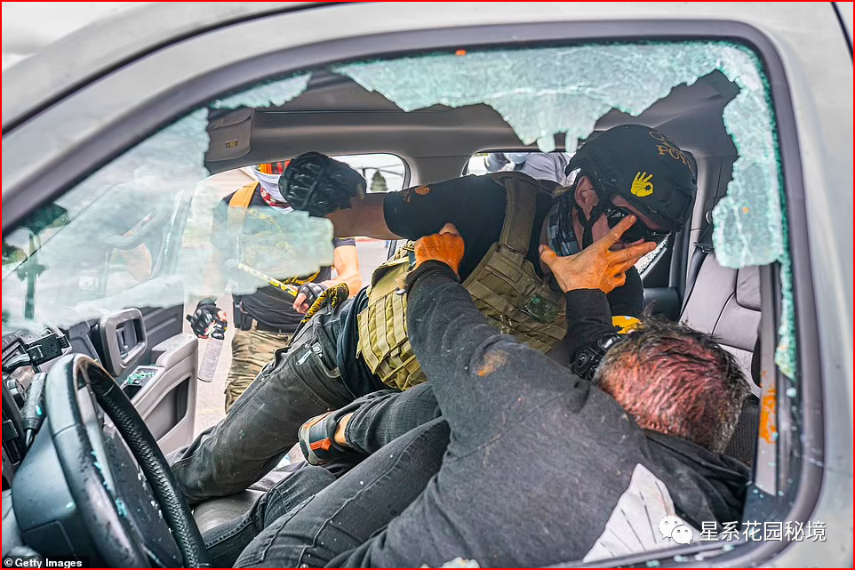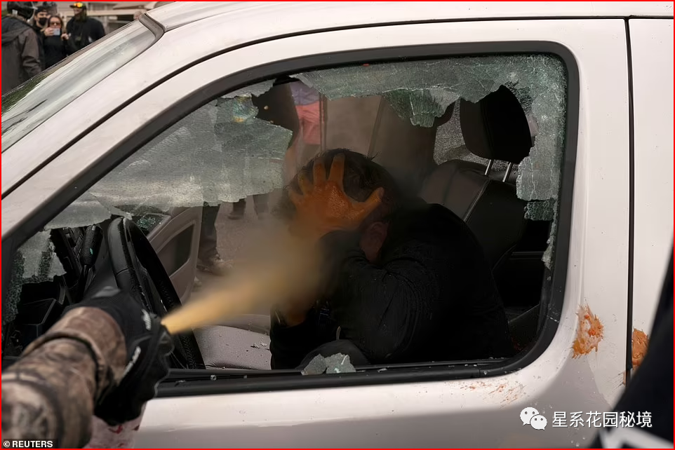 搞笑的是,至少两辆试图冲出去的车被参加“爱上今夏”活动的人掀翻了,其中一辆车上喷着字母FAFO,这代表着骄傲男孩们的口号:“Fuck四处看,再找出答案。”