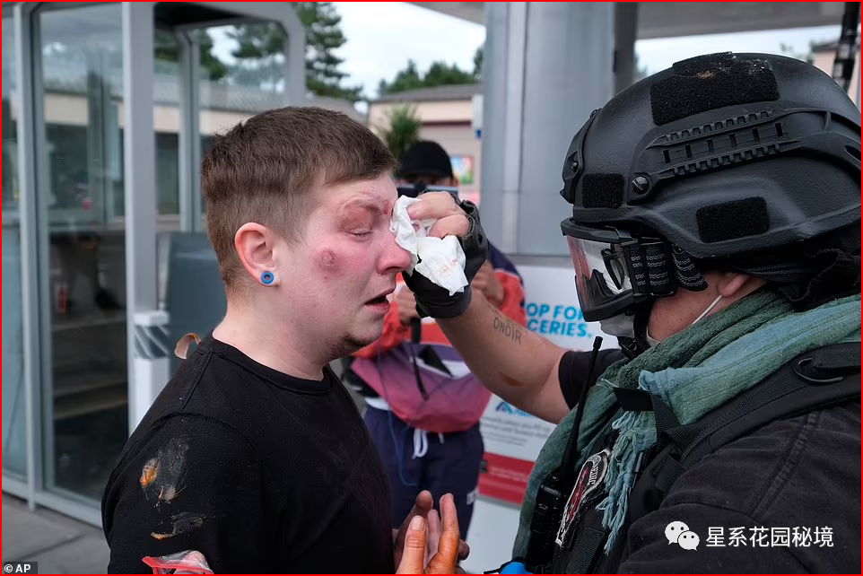 他们爬出车,发现面前有一个人举着一面大横幅,上面写着:“只有耶稣能从地狱里出来。”旋即,他们被狠狠揍了一顿…… 据警方称,到下午4点,波特兰东北部的“只有少数人”犯下了“暴力和破坏行为”。(自从市议会接受黑衣抗议者的条件,砍掉了当地警察的经费,警方看上去是越来越懒得管事了) 在当时发出的一条官方推特中,当地警方命令所有市民出行时避开东北122大道和桑迪大道附近的区域,因为那里正在械斗。那里便是被遗弃的K-Mart停车场附近。