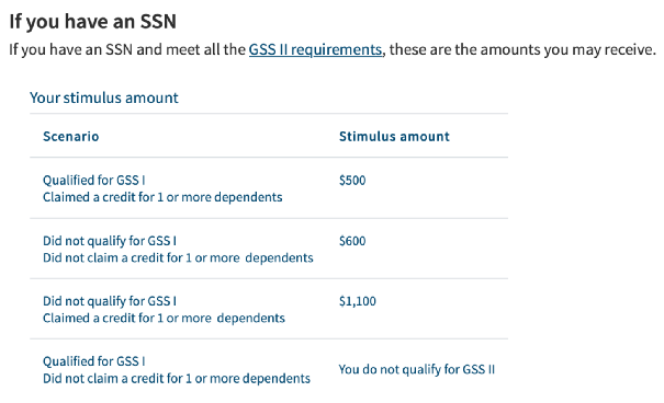 该网站里面有关于如何获得经济补助的具体说明: 1.如果你有一个SSN,并满足所有的相关要求,你将收到如下金额:每人600美元,有孩子加500美元。 2.如果你有一个ITIN(个人纳税识别号码),并满足所有的相关要求,1000美元可能是你收到的金额: