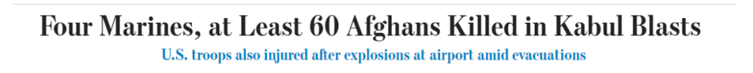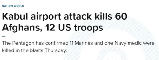 突发!阿富汗喀布尔国际机场附近8月26日发生两起爆炸,目前至少造成72名阿富汗平民死亡、13名美国海军陆战队员死亡、120人受伤。死伤人数还将上升!
