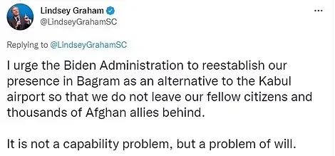 参议员林赛·格雷厄姆(Lindsey Graham)说:我敦促拜登政府重新建立巴格拉姆空军基地,作为喀布尔机场的替代方案,这样就不会把我们的同胞和成千上万的阿富汗盟友抛弃。这不是能力问题,而是意志问题。