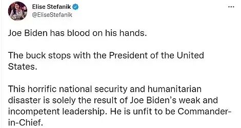 国会众议员埃莉斯·斯特凡尼克(Elise Stefanik)说:乔拜登手上沾满了鲜血,美国总统要负全责,这场可怕的国家安全和人道主义灾难完全是乔·拜登软弱无能领导的结果,他不适合担任总司令。