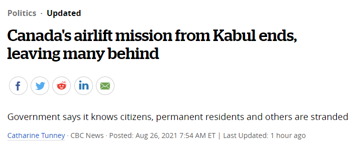 加拿大目前已经终止了所有从喀布尔机场撤离的航班,最后一架飞机刚刚于周四凌晨离开。