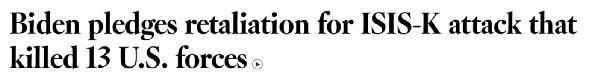 “这些ISIS恐怖分子不会获胜。我们将营救美国人。我们会让我们的阿富汗盟友离开。我们的任务将继续,”总统说。“美国不会被吓倒。”