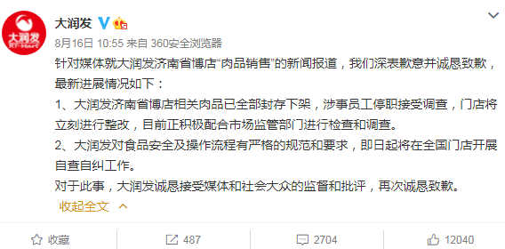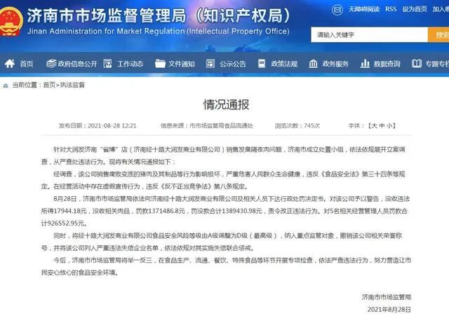 8月28日,据济南市市场监管局网站通报,针对济南市大润发超市“发臭隔夜肉洗了再卖”事件,对该公司警告并罚没近139万元,责令改正违法行为。