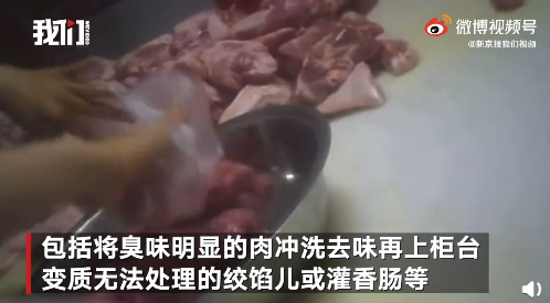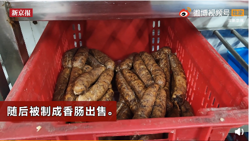 最让人无法接受的是,在前述记者卧底期间,发现每隔三四天,那些混杂了边角料和变质肉的冷冻肉糜,就被切成小块放到大盆里,先铰成肉馅,再根据肥瘦的不同,按照不同的配方,腌制成一红一黑两种香肠料。