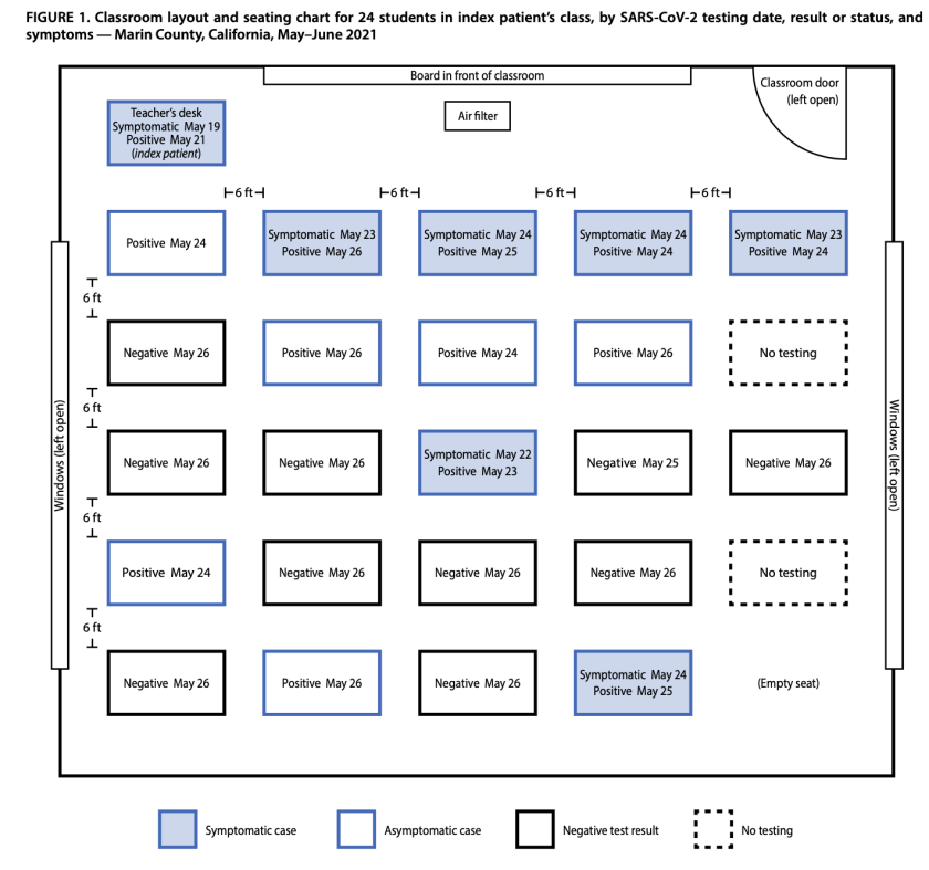 所有确诊学生中,感染病毒的学生大多数坐在前排,在最靠近教师办公桌的两排座位中,80%(10人中有8人)的人呈阳性;