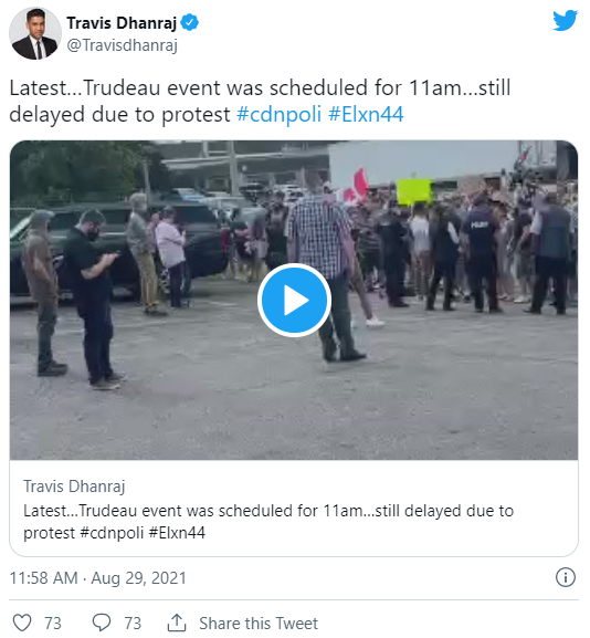 上午,联邦自由党在安省剑桥市发表演讲,以宣传其政党的气候变化政策时,由于受到干扰,被迫将杜鲁多的露面推迟了1个小时。