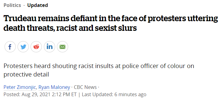 当一名抗议者对杜鲁多的安保小队中的有色人种警察大喊种族主义言论时,CBC News的记者刚好就在现场。而另一名抗议者据说对一名女警察发表厌恶女性的言论。