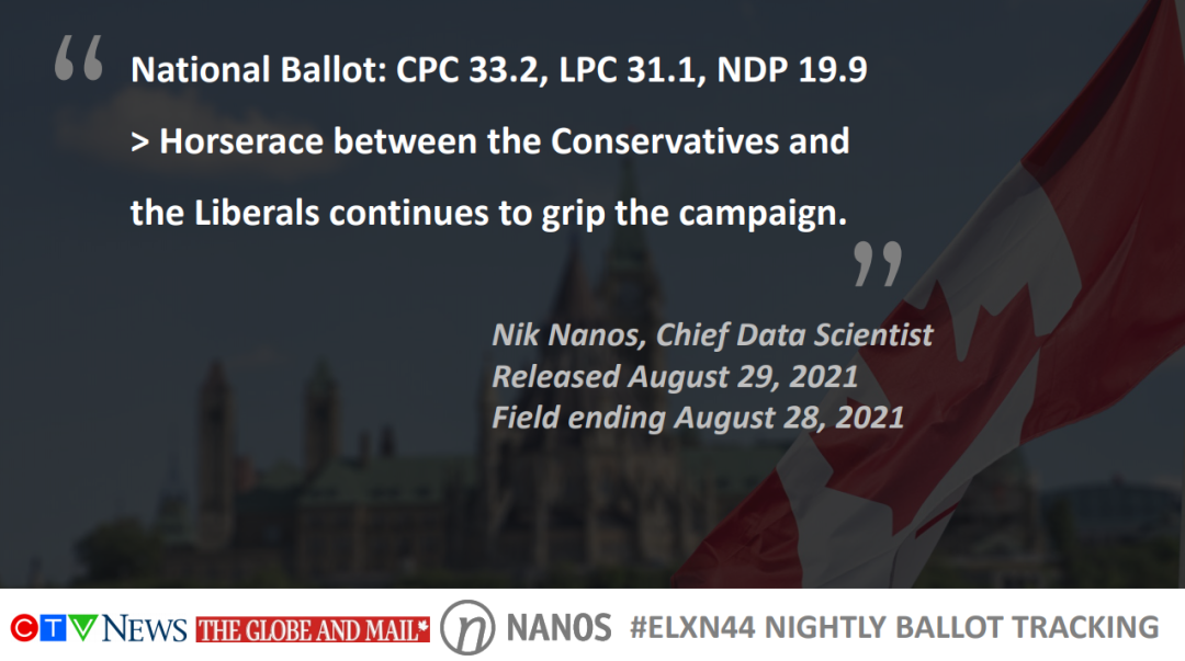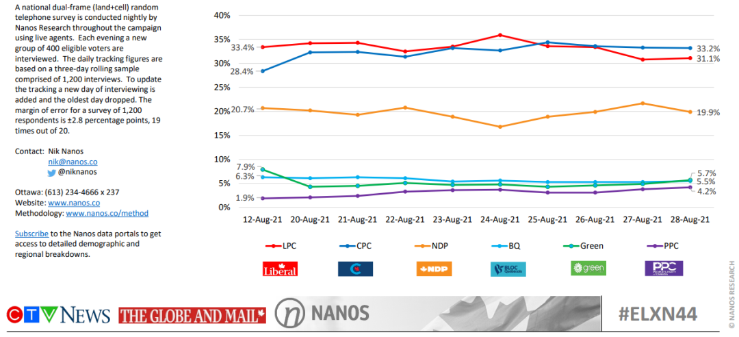 另一家数据机构Nanos,于8月29日公布的民调数据显示,保守党支持率为33.2%,自由党支持率落后,为31.1%。