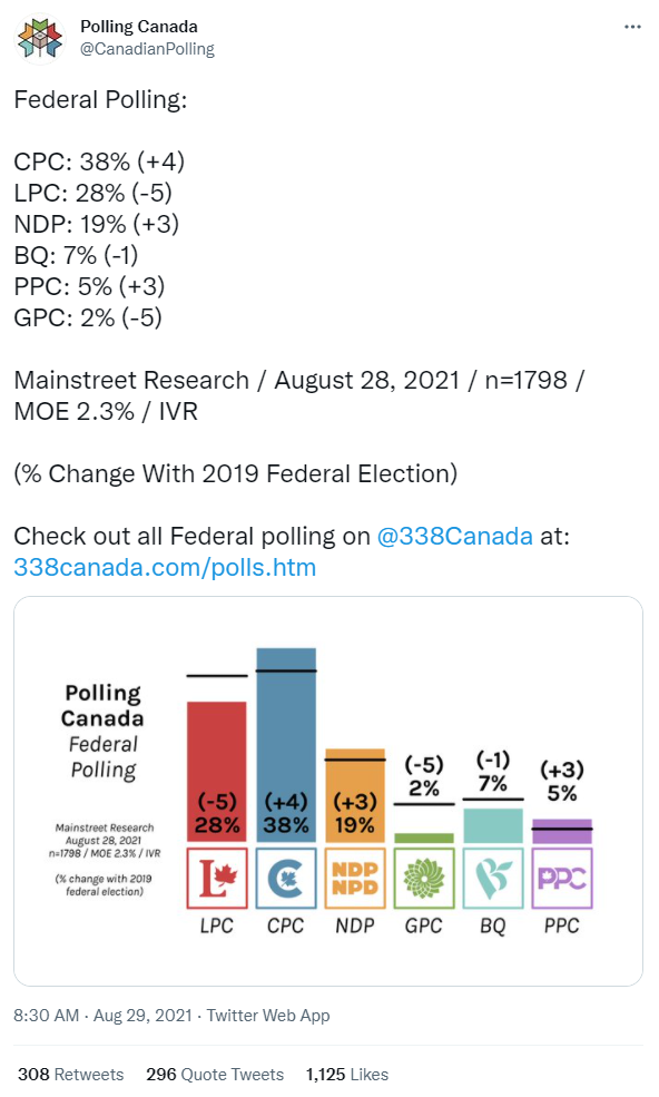 今天(8月29日),Polling Canada发推特表示,Mainstreet Research于8月28日公布的最新民调数据显示,保守党(CPC)支持率上涨4个百分点,达到38%;自由党(LPC)支持率下跌5个百分点,仅剩28%;两大政党的差距已经达到10%。