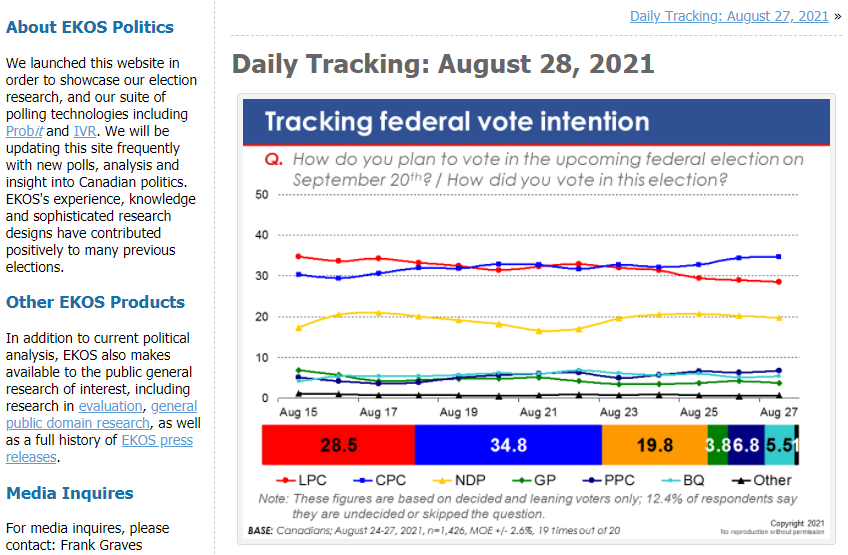 EKOS于8月28日更新的民调数据有也有类似结论:保守党支持率为34.8%,已经领先自由党6.3个百分点。