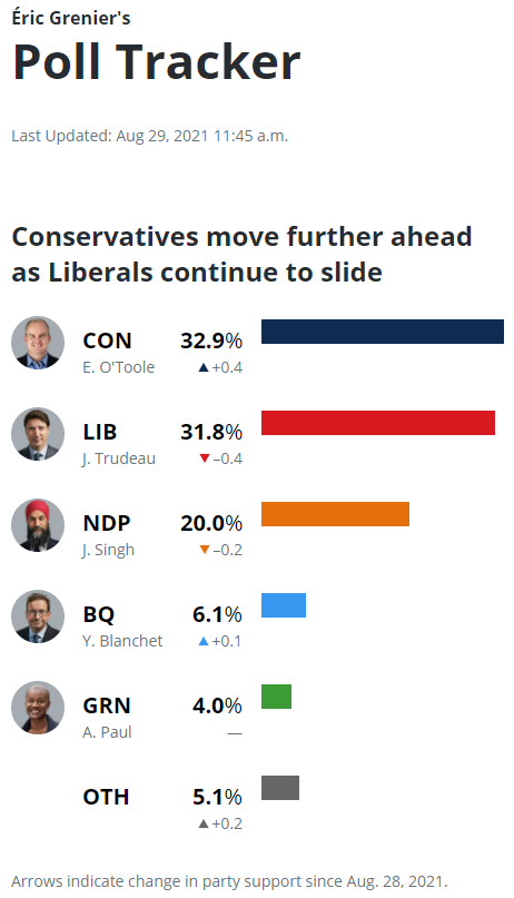 CBC News引用的Éric Grenier's Poll Tracker最新数据显示,奥图尔领导的保守党支持率已经上涨至32.9%,杜鲁多领导的自由党支持率已经跌至31.8%。