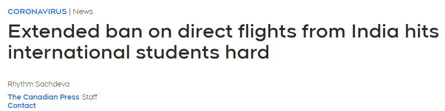 4月22日,随着印度新冠肺炎病例激增,加拿大宣布了对印度直航的禁令,并于本月再次延长。