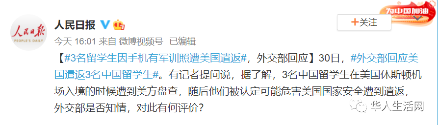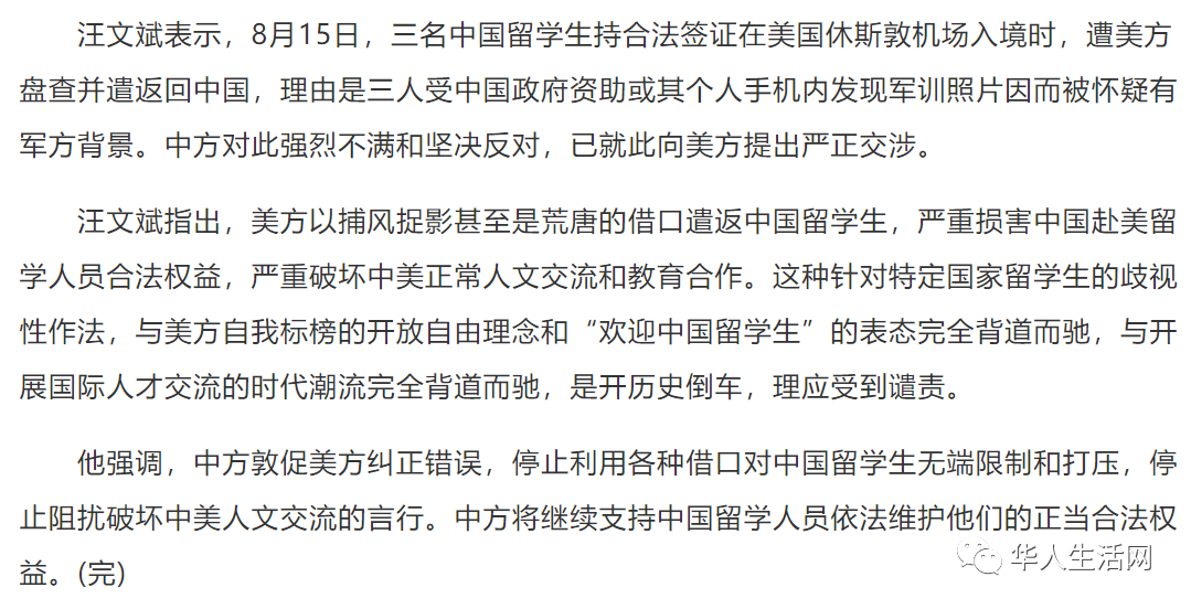 8月15日,三名中国留学生持合法签证在美国休斯顿机场入境时遭美方盘查,并遣返回中国,理由是三人受外国政府资助,或其个人手机内发现军训时的照片,因而被怀疑有军方背景。