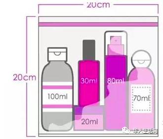 液体 手提行李中的液体、喷雾剂或发胶容器,大小必须等于或小于100毫升。所有容器必须密封装入容量为一升的透明塑料袋中,每人限带一个塑料袋。塑料袋容量不得超过1升,即大约为20X20厘米或15X25厘米。