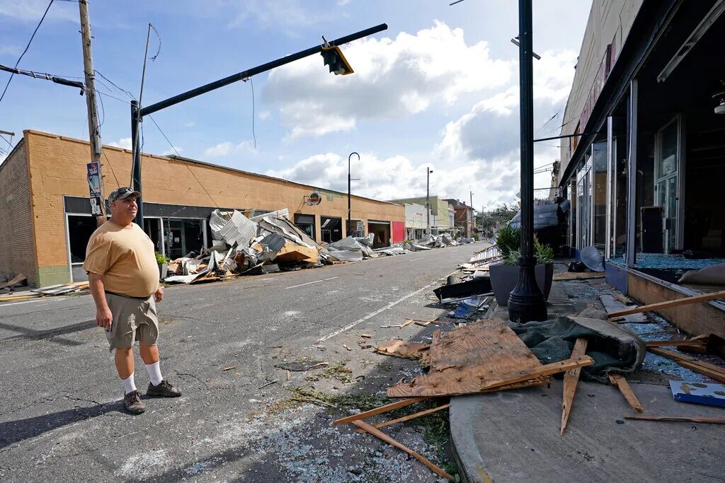 8月30日,路易斯安那州侯马市,市中心的企业主在查看飓风艾达(Ida)过后主街上的一些商铺受到的损害。图源:美联社。
