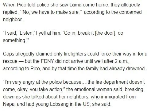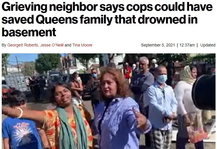 另一位邻居在接受采访时声称,纽约警察放弃了救援这家人的机会,是随后赶到的消防员将水抽干后,才见到了尸体。