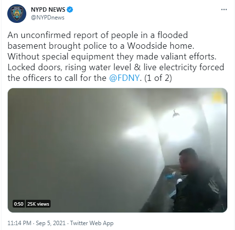 “在没有特殊设备的情况下,他们做出了英勇的努力。”纽约警察局写道,“门锁着、水位上升和通电迫使警察打电话给@FDNY。 ”