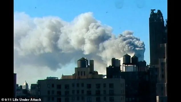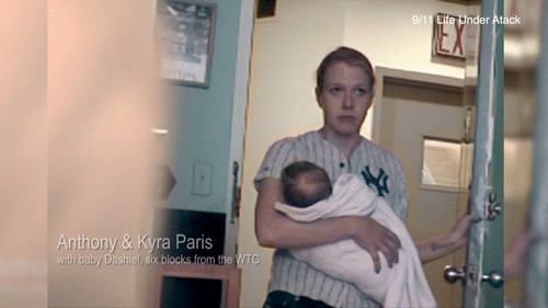 在第一段视频中,一对抱着新生儿的夫妇在自家楼顶记录下了飞机撞向世贸大楼后的现场。