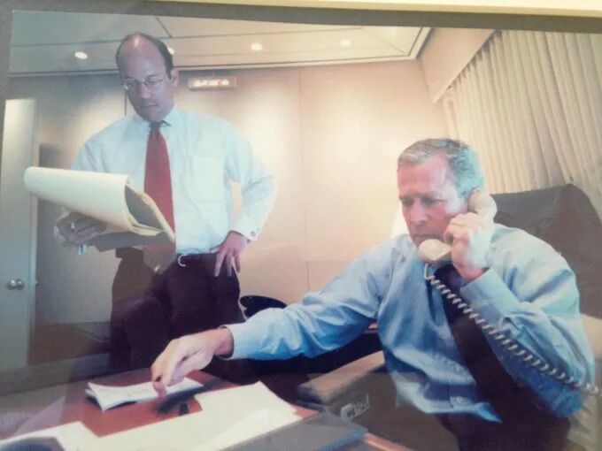 美国总统乔治·布什正要走入佛罗里达州萨拉索塔的艾玛·E·布克小学的教室,他被告知“一架小型双引擎螺旋桨飞机”撞上了其中一座双子塔。