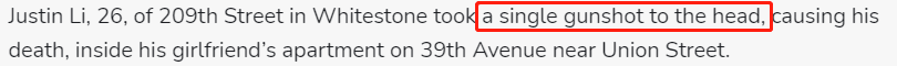 而根据纽约报纸AM New York Metro消息,李先生的头部中了一枪,导致其死亡。