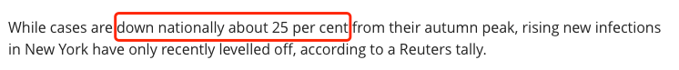 路透社也表示,全美新增病例比9月初的峰值时期下降了25%。