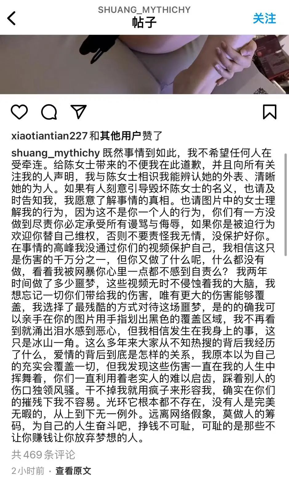 并发文称,事已至此,不想任何人受到牵连。给陈女士带来不便我很抱歉,也请图片中的女士理解她的行为。最后还说,赚钱不可耻,可耻的是不让你赚钱让你放弃梦想的人。