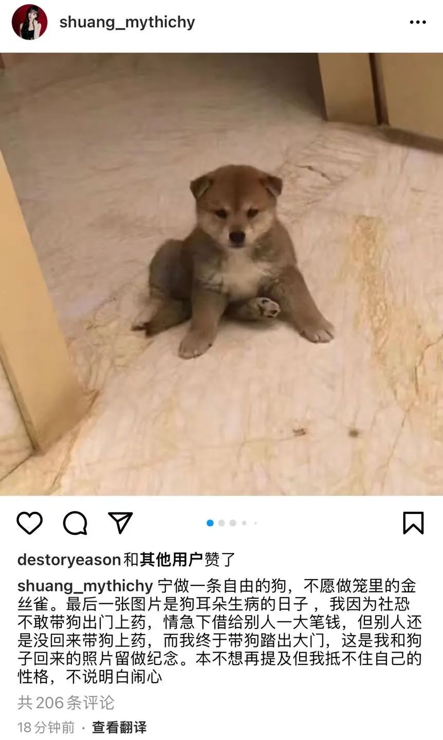 还发了一条帖子说狗生病了,自己社恐不敢出门,只能借钱给别人带狗去看病,嘤嘤嘤,最后本仙女还是带狗去看病了(我看了3遍,应该就是这个意思吧)。