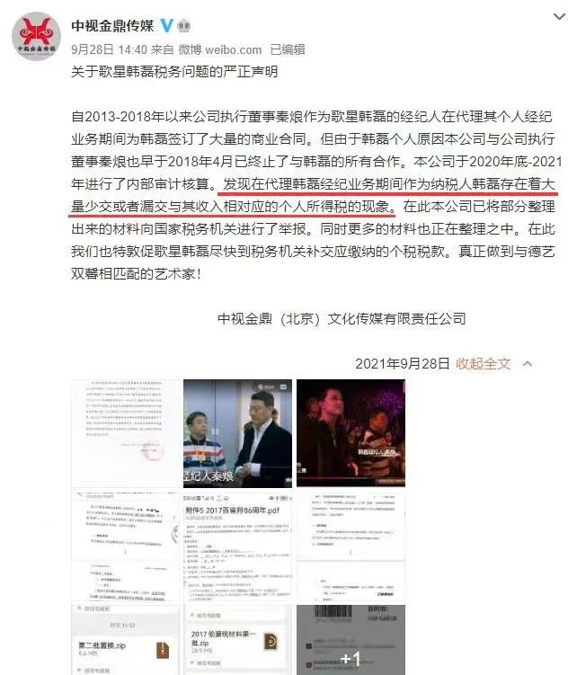 9月28日,韩磊前经纪公司官微发文,公司在内部审计核算中发现,在代理韩磊经纪业务期间,韩磊存在“大量少交或者漏交与其收入相对应的个人所得税的现象”,并提到已经收集材料向国家税务机关进行举报。
